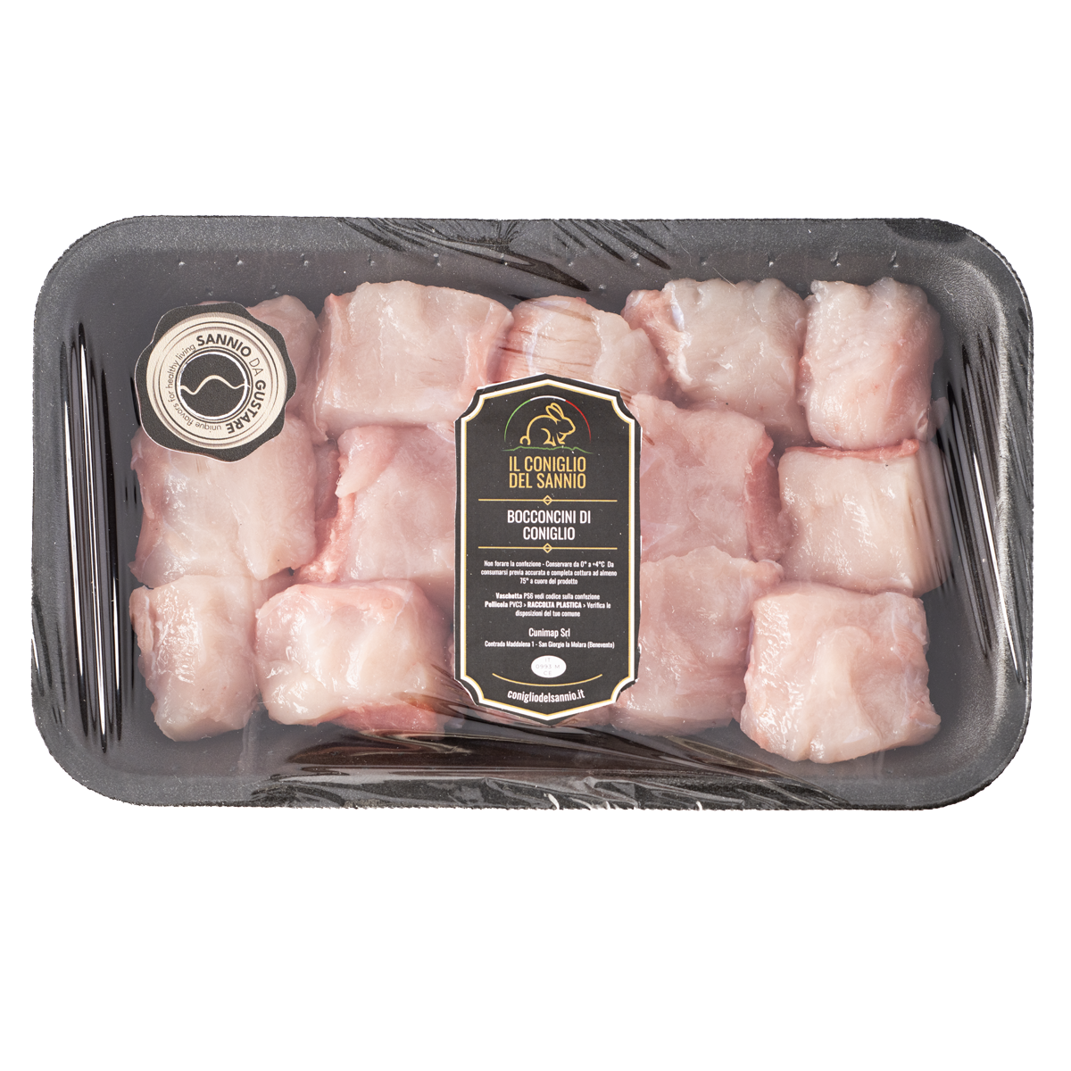 I Bocconcini di Coniglio sono pezzi selezionati di filetto di coniglio del Sannio. Il taglio preciso, la selezione delle carni e il controllo della produzione rendono unico al palato sopraffine la qualità del prodotto.