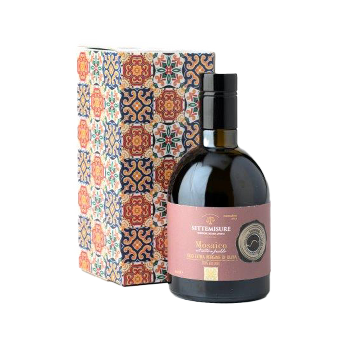 Mosaico è un olio monocultivar realizzato dalla famosa varietà ortice. Un olio extravergine d’oliva caratterizzato da sensazioni vegetali intense e note aromatiche accentuate. Al naso è ricco e inteso, caratterizzato da note balsamiche di basilico, mente e salvia. In bocca si offre deciso e complesso, con spiccato ricordo di sedano, pomodoro e mela matura. Disponibile nel formato 500 ml.